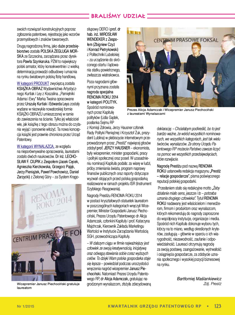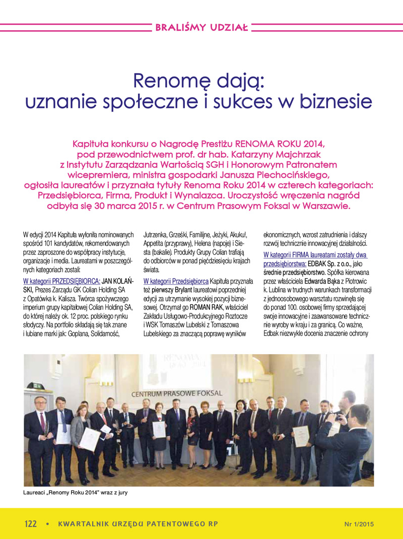 Kapituła konkursu o Nagrodę Prestiżu RENOMA ROKU 2014, pod przewodnictwem prof. dr hab. Katarzyny Majchrzak z Instytutu Zarządzania Wartością SGH i Honorowym Patronatem wicepremiera, ministra gospodarki Janusza Piechocińskiego, ogłosiła laureatów i przyznała tytuły Renoma Roku 2014 w czterech kategoriach: Przedsiębiorca, Firma, Produkt i Wynalazca. Uroczystość wręczenia nagród odbyła się 30 marca 2015 r. w Centrum Prasowym Foksal w Warszawie.
